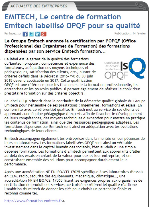 EMITECH, Le centre de formation Emitech labellisé OPQF pour sa qualité