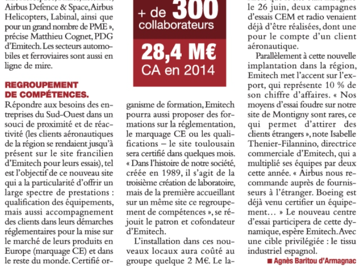 Le Groupe EMITECH qui compte désormais 4 filiales avec l'acquisition de DIRAC TECHNOLOGY en début d'année, poursuit son développement conformément à sa stratégie de services de proximité, de réactivité et de qualité avec la création d'un nouveau laboratoire à Toulouse.